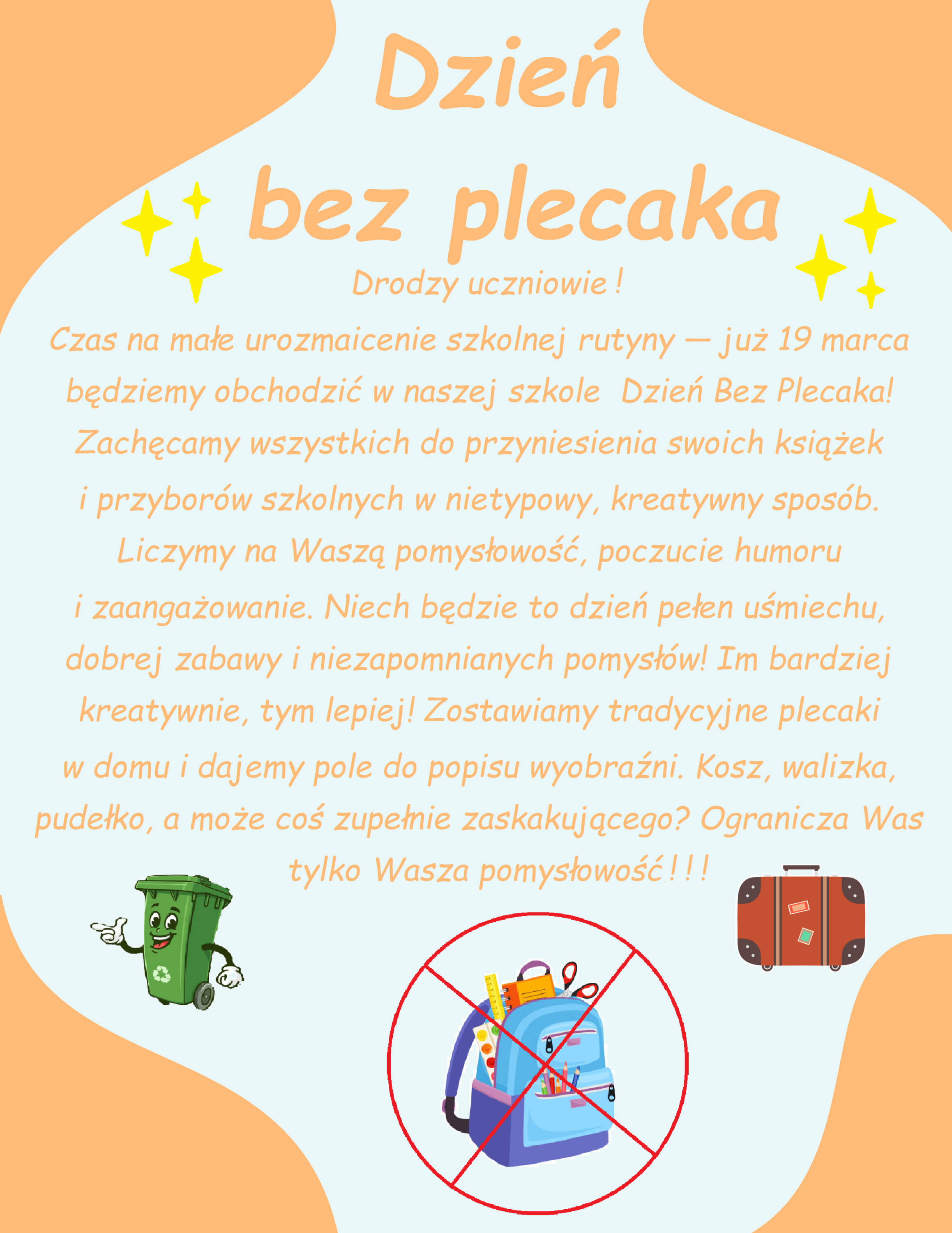 23 marca odbył się w szkole wyjątkowy i pełen kreatywności „Dzień bez plecaka”. Tego dnia uczniowie mogli przynieść swoje książki i przybory szkolne w dowolny, nietypowy sposób – byle nie w tradycyjnym plecaku. Pomysłowość uczniów przerosła wszelkie oczekiwania! Na szkolnych korytarzach można było zobaczyć książki przewożone w walizkach, koszykach, skrzynkach na narzędzia, a nawet w …
