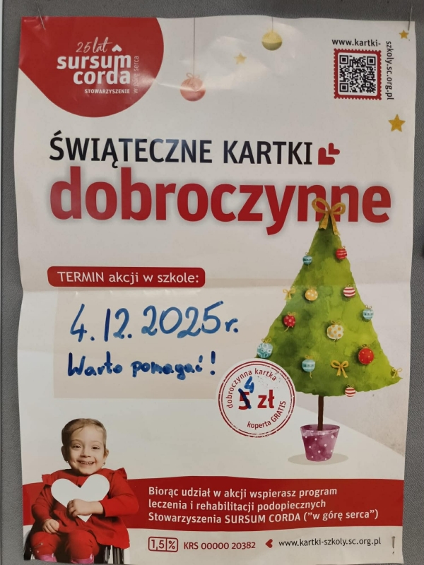 W listopadzie Samorząd Uczniowski przeprowadził akcję „Świąteczne Kartki dobroczynne”, która spotkała się z dużym zainteresowaniem całej społeczności szkolnej. W ramach przedsięwzięcia udostępniono do sprzedaży wyjątkowe kartki świąteczne przygotowane przez Stowarzyszenie „Sursum Corda – w górę serca”. Dzięki dużemu zaangażowaniu uczniów i hojności kupujących udało się zebrać kwotę 218 zł, która zostanie przekazana na pomoc osobom …